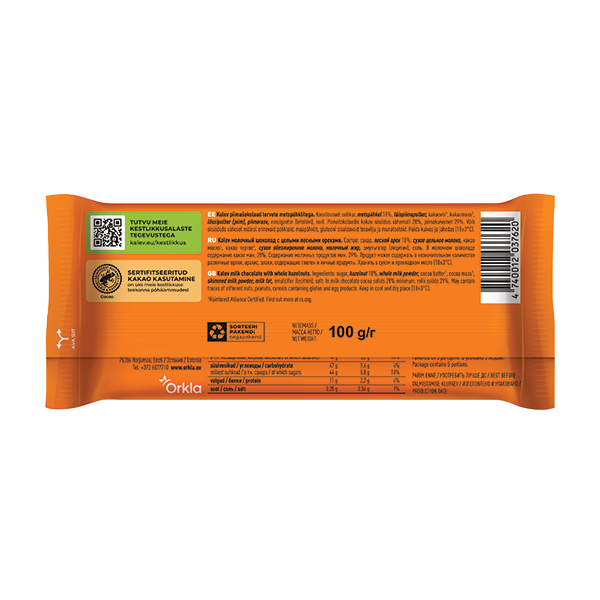 Kalev piimašokolaad tervete metspähklitega – pehme piimašokolaadi (kakao vähemalt 28%) ja krõbedate metspähklite (18%) klassikaline kooslus. Rikkalik ja tasakaalus maitse, mis sobib igasse hetke.